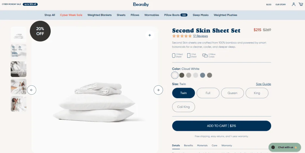 Bearaby Bamboo Sheets are another good choice when you’re looking for something to mitigate overheating and night sweats. They’re soft, light, and help keep bacteria to a minimum (cutting down on 99.9% of it for better breathing, fewer allergens, and clearer skin).