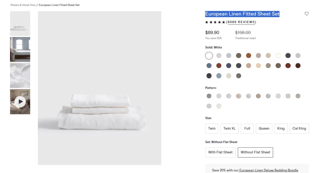 If you love variety, the Quince European Linen Fitted Sheet Set is the one to check out first. They have about 35 colors and patterns to choose from, sizes from Twin to Split King, and you can get it with or without a flat sheet (you pay less if you skip it).