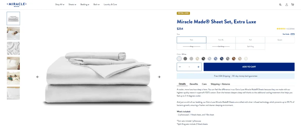 The return window is a full year, so you don’t need to worry about wasting money. That’s a relief, since they’re on the pricier side – just over $300.00 regular price if you’re shopping for a Queen size. King costs about $350.00. The other good news is, you’ll probably be able to catch them on sale if you check back periodically. For example, as of this writing, the Queen set is $247.00, and the King is $279.00.