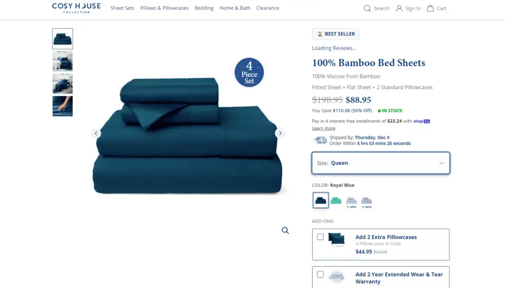 The return window is a full year, so you don’t need to worry about wasting money. That’s a relief, since they’re on the pricier side – just over $300.00 regular price if you’re shopping for a Queen size. King costs about $350.00. The other good news is, you’ll probably be able to catch them on sale if you check back periodically. For example, as of this writing, the Queen set is $247.00, and the King is $279.00.