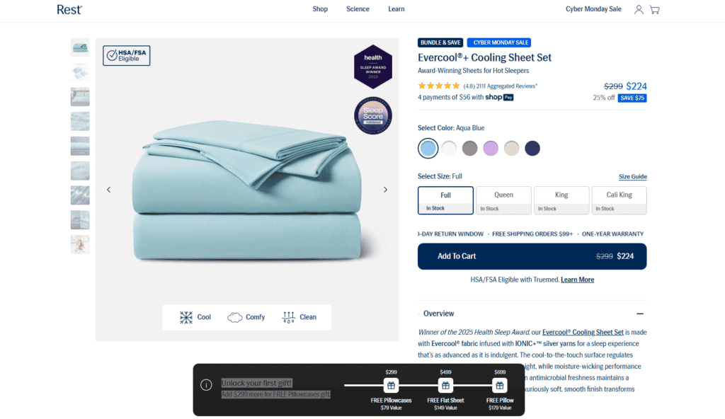 The Rest Evercool sheets feel cool to the touch and have silver woven through the fabric to help keep you cool and keep your sheets fresh longer. The proprietary fabric is designed to keep you cool, and they report that 92% of users reported better temperature regulation with these sheets.