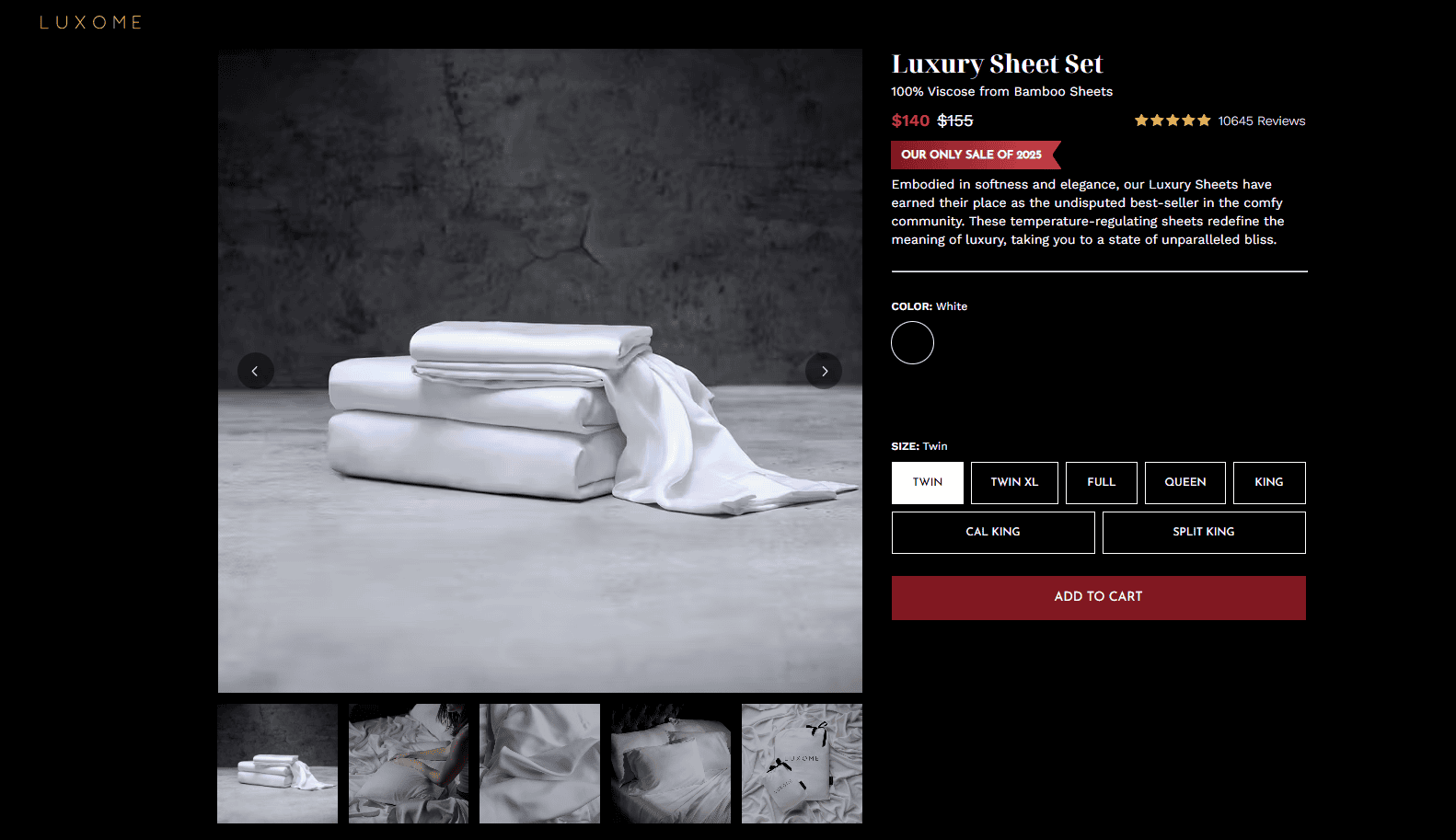 Luxome Luxury sheets combine the lightness and coolness of bamboo with the luxury your body craves when it’s time to turn in for a successful night’s sleep. They’re available in 12 colors – some soothing and neutral, others rich and bold – and come in Twin, Twin XL, Full, Queen, King, Cali King, and Split King.