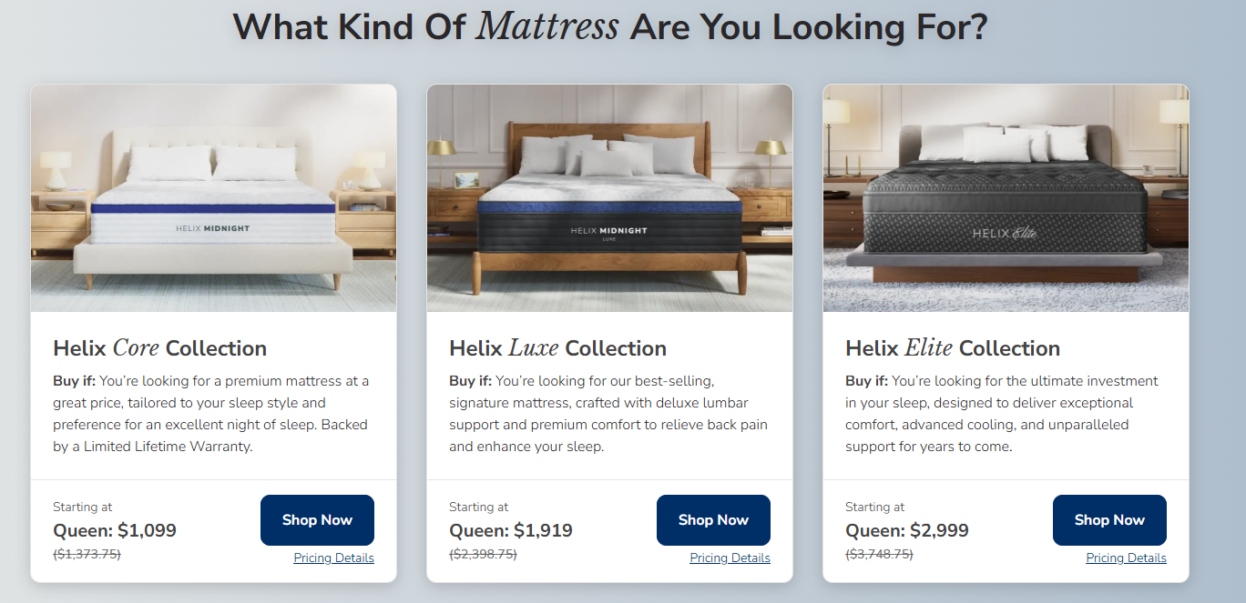 Helix also has three collections (Core, Luxe, and Elite) but goes further by offering soft, medium, and firm variants across all of them. They also have specialty picks that Casper doesn’t: