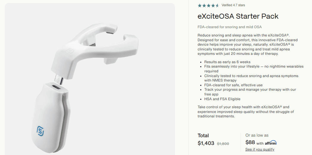 eXciteOSA is different. While it is FDA-cleared, it takes time for insurance to approve coverage, which means you’re paying out of pocket. You can use HSA / FSA funds to purchase, and there’s a walkthrough in Spring Sleeps FAQs on how to do that. The starter kit is $1,650 and comes with both an initial mouthpiece and one free replacement. That said, Spring Sleep does offer a 90-day risk-free trial (and they say you should see results in four weeks), so if it doesn’t work, you can get your money back.
