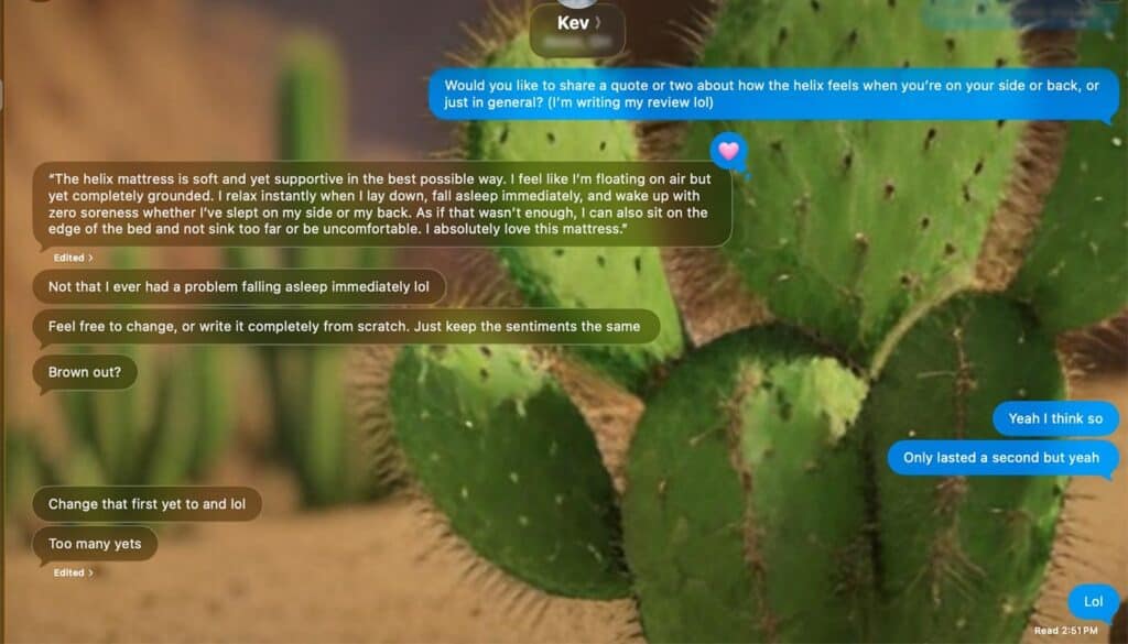So was I, in fact. I sat in bed for a long while, reading on my Kindle as I often do, and the difference in the support of the Helix Midnight Luxe was really obvious right away. I hadn’t realized how often our old mattress made me shift to get into a comfortable position until I wasn’t doing it every five minutes.