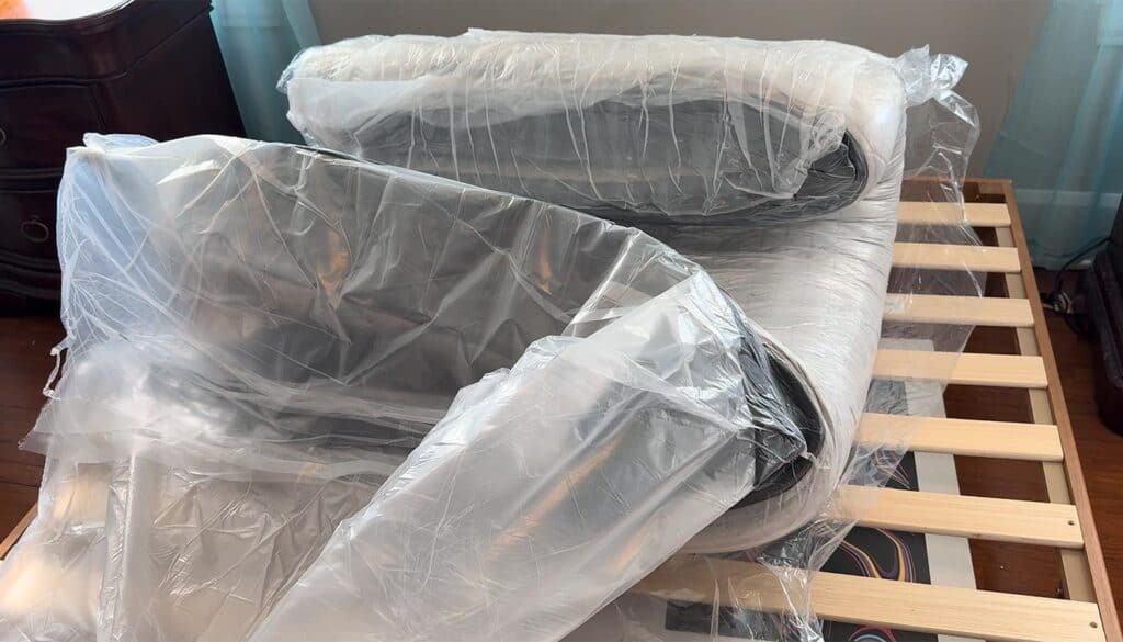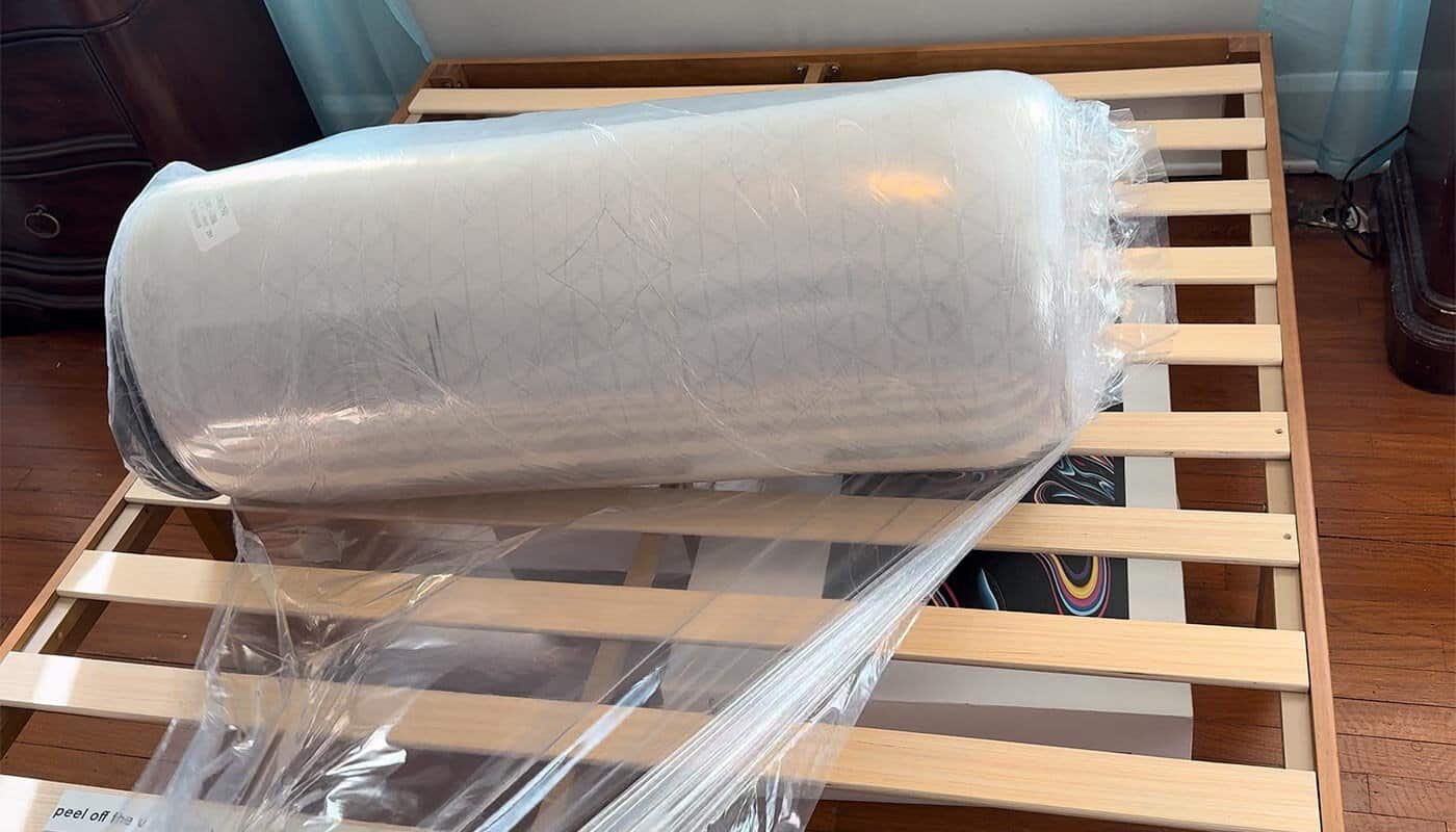 We soon figured out that the easiest way to unwrap it was to pull the plastic from the underside and roll the mattress away from ourselves across the slatted frame, repeating that movement over and over.