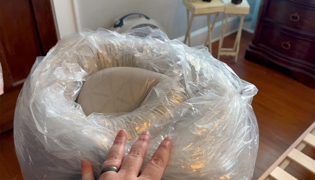 Once that was removed, the mattress started to “hiss” as it inflated a little, so we pulled the rest of the plastic off it and positioned it on the bed.