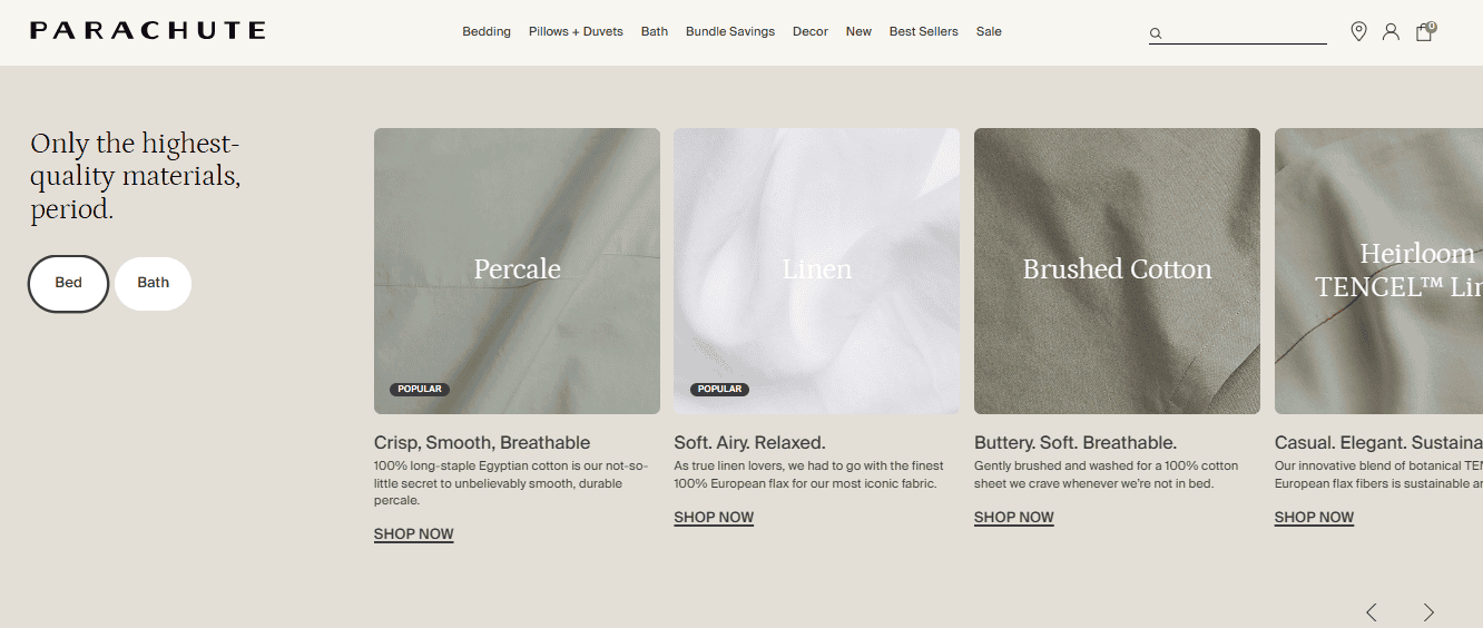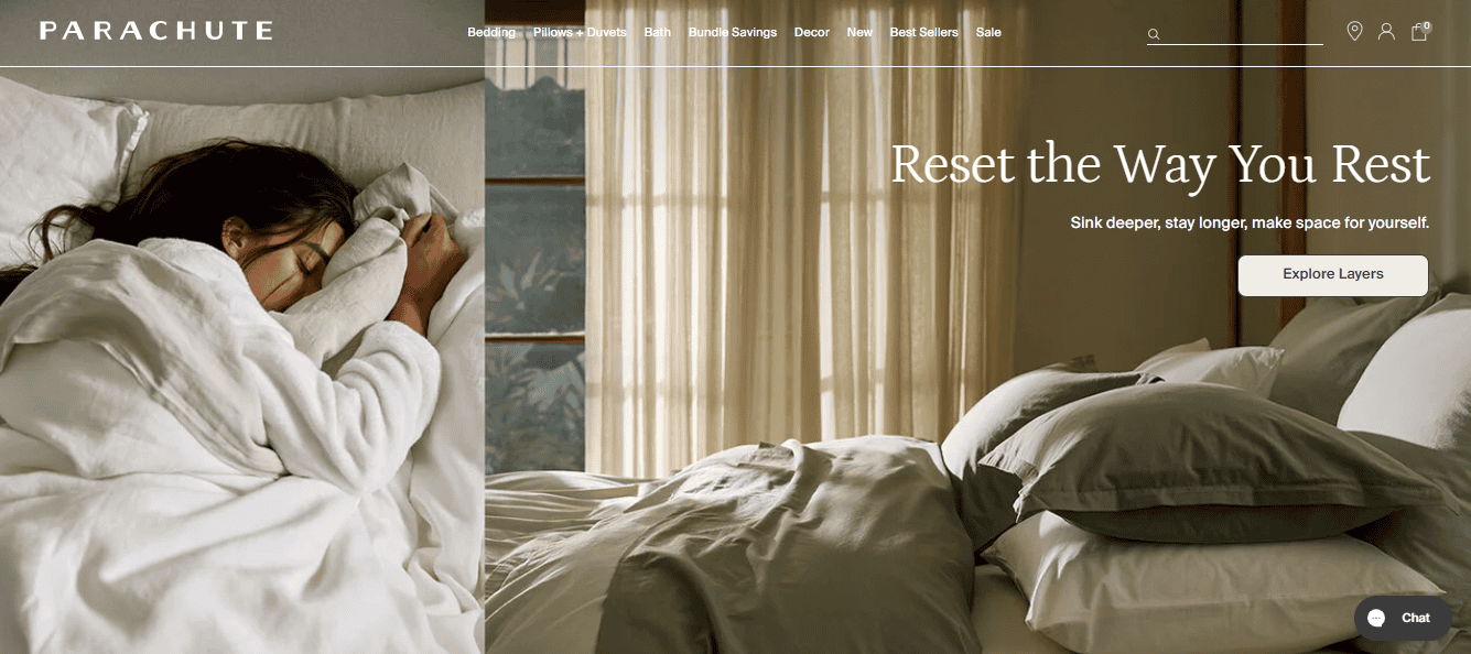 Parachute was founded in Venice Beach in 2014, and everything about the brand reflects that West Coast, minimalist-meets-cozy aesthetic. They talk about sustainability, craftsmanship, and creating a home that feels intentional but still approachable. Their products are priced like boutique goods, and their customer base tends to skew toward people who want design-driven home essentials.