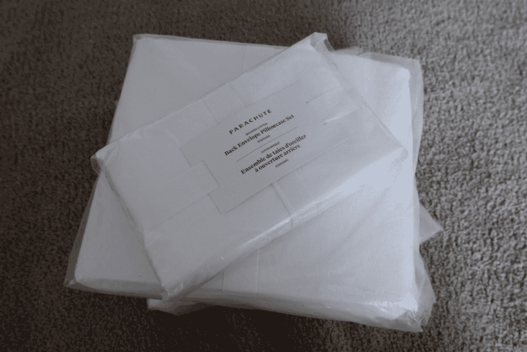 My Parachute sheets arrived within a few days and came minimally packaged. I like that the pillowcases were packaged separately from the bedsheets. The brushed cotton set came with back envelope-style pillowcases, which means the opening is in the center of the back rather than along one side. Certain sets give you the option to choose which of the two types of pillowcases you want.