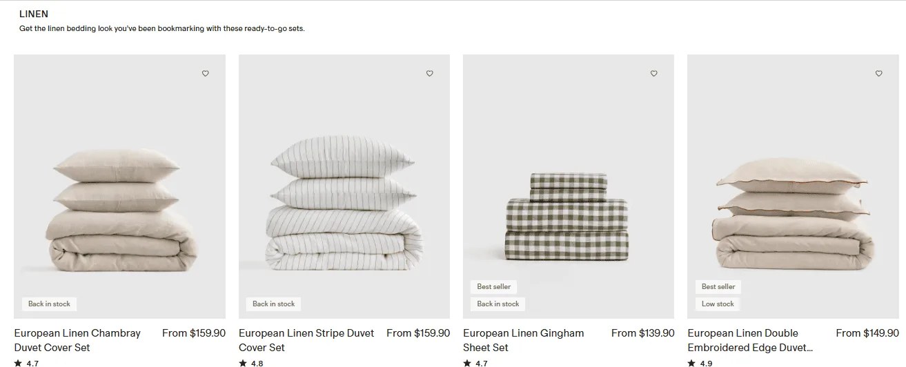 Like Parachute, Quince also does much more bedding beyond sheets. Their non-sheet bedding includes duvet and comforter sets, quilts, and bundles that often combine duvet covers + shams + inserts.
