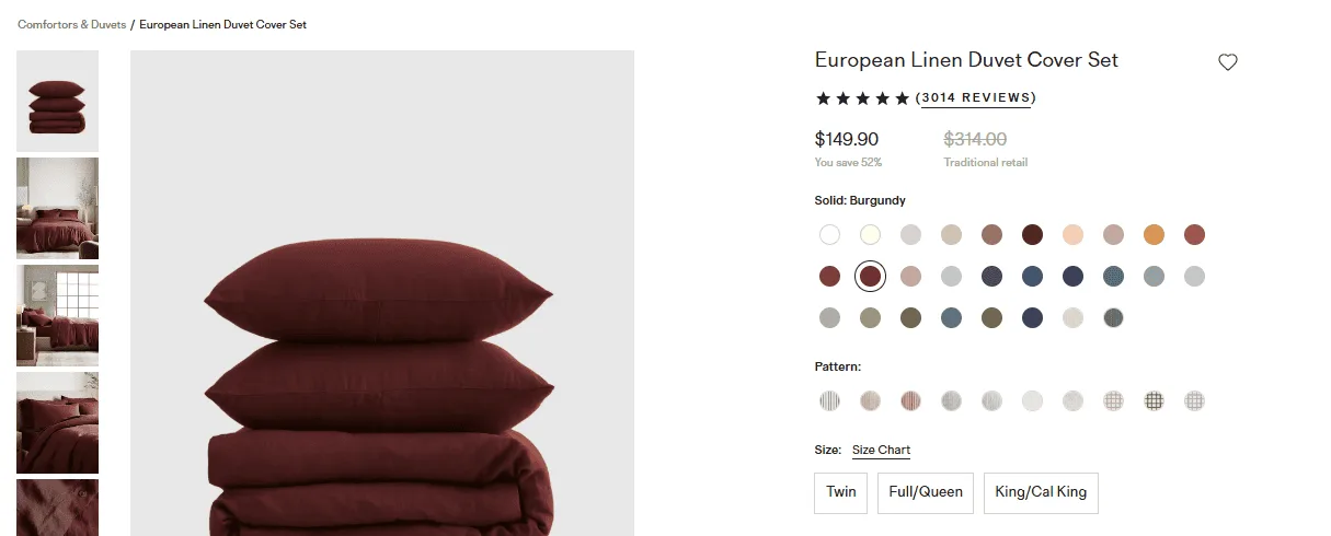 Quince, on the other hand, launched in 2018 with a very different model: cut out the middlemen and markups that typically drive luxury prices up, and sell directly to the customer at a “radically transparent” price point. Their branding is more about aesthetics meets value. They don’t just do bedding—they also sell clothing, accessories, and even furniture at surprisingly low prices. They’re one of my go-to places for clothing basics, but this was my first time trying their bedding.