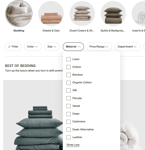 - Cotton: Percale, sateen, brushed, and cashmere cotton, with a few organic options