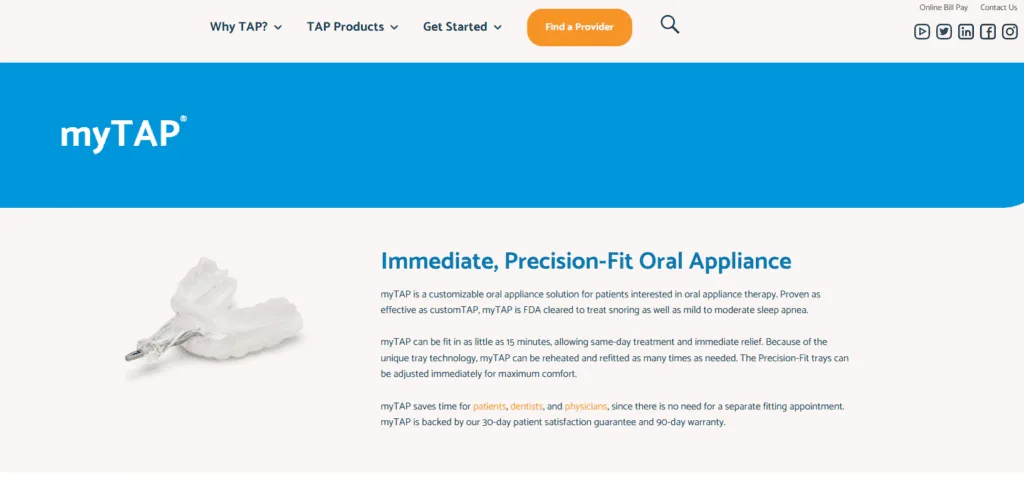 | myTAP Oral Appliance | Same-day fit | Moldable in 15 minutes, prescription required |